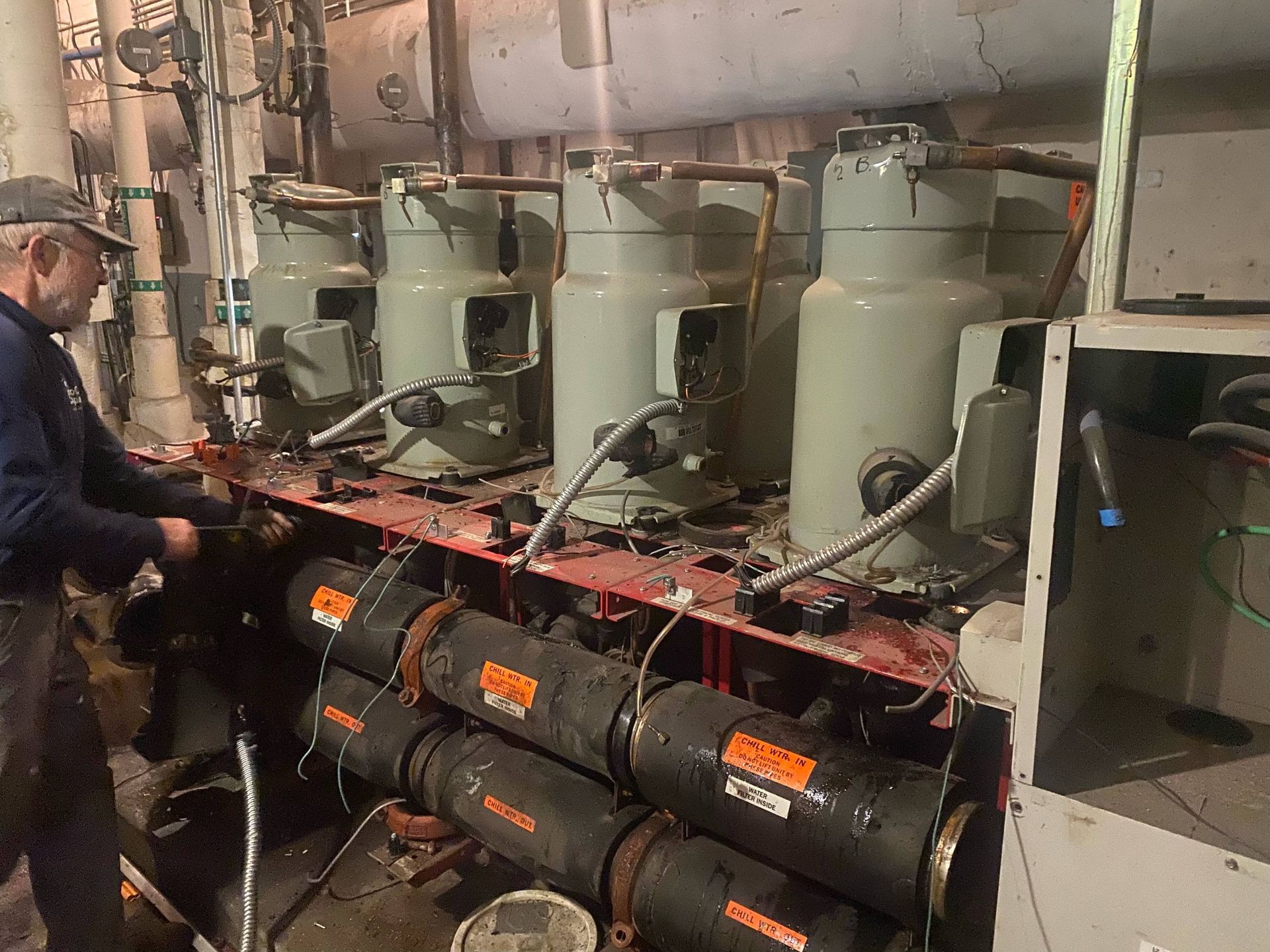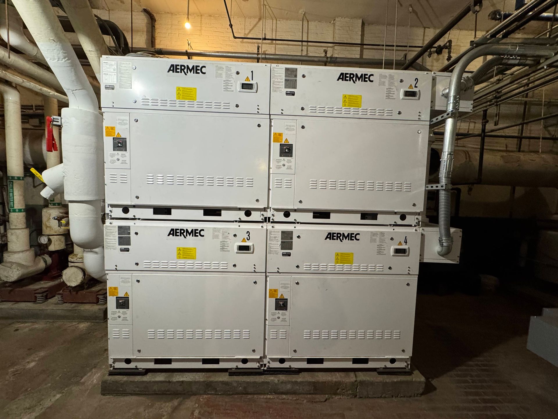 TurboChyll delivered a turnkey modular chiller replacement, upgrading four legacy Multistack units to four new 30-ton Aermec modular chillers. The scope included engineering and design coordination, turnkey installation, electrical, insulation and piping upgrades, and preparation for future building management system (BMS) integration. A Phase 2 planned to add new condenser and chilled water pumps with VFDs to improve efficiency.